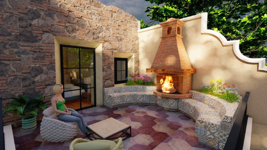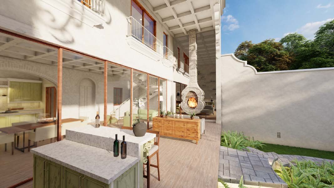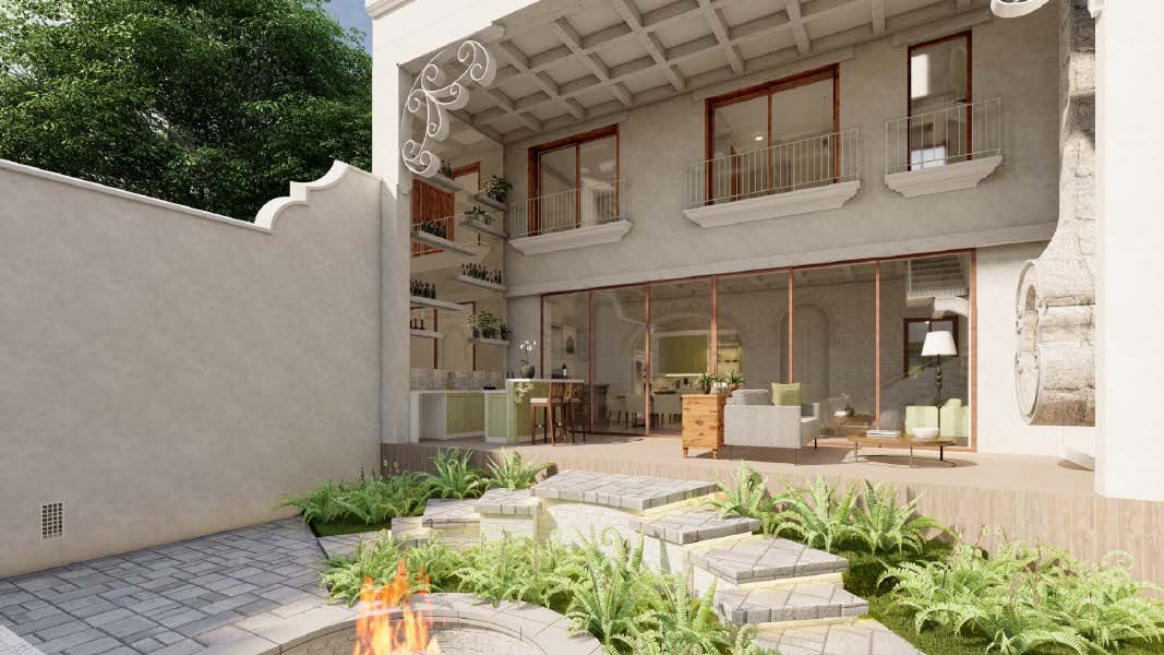 Among the architectural elements that give this home its distinctive character are the use of ruin-style walls and vaulted ceilings, reflecting the traditional Antigua aesthetic. The spacious backyard also stands out, featuring unique details such as an aqueduct-style ruin that blends seamlessly with the pool and jacuzzi area.