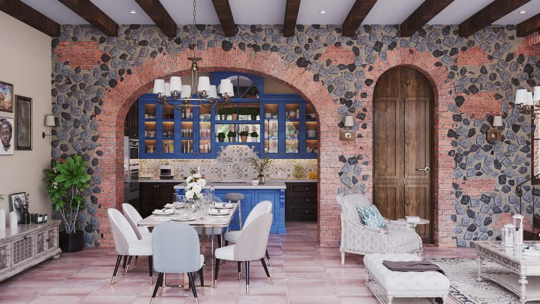 Entre los detalles arquitectónicos que le dan carácter a esta casa destacan la chimenea ubicada en el área social exterior de doble altura, una segunda chimenea en la sala del sótano, y los arcos que enmarcan las escaleras exteriores que conducen al sótano. Estos elementos se complementan con una fuente/jacuzzi que añade un toque distintivo al diseño.